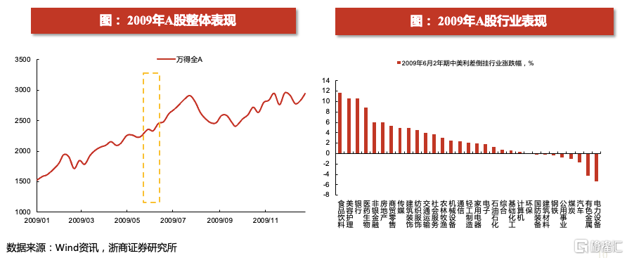 A股在这一轮中美利差倒挂的阶段中,走出了震荡上升的行情。当时中美利差倒挂的背后反映出的是金融危机后中美经济复苏的节奏不同步,美国经济修复晚于中国一个季度左右的时间,因此2009年6月美债快速上升的阶段反倒是国债走平的阶段。A股在这轮中美利差倒挂的时期以及倒挂的前后,均处于震荡上升的走势,彼时国内经济在四万亿的刺激之下仍处于快速修复的阶段。