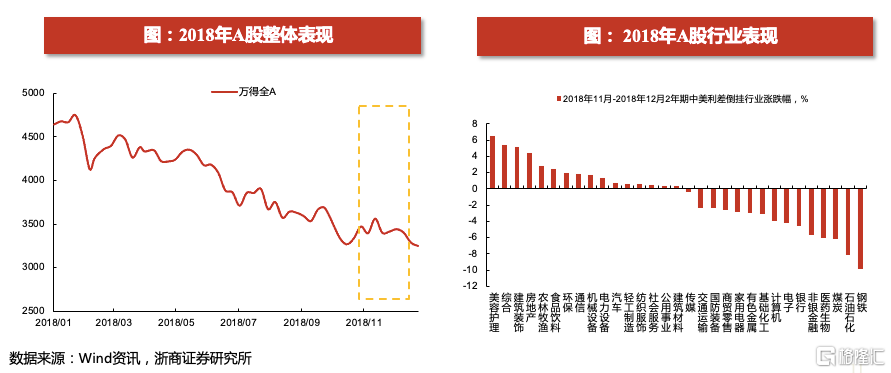 行业表现来看,消费行业在市场调整的阶段中表现相对出色。这一轮中美利差收敛倒挂(2018年11月-2018年12月),美容护理、农林牧渔、食品饮料等消费行业呈现逆势上升的态势。此外,部分周期行业如建筑装饰、房地产和环保也展现出一定防御的属性。