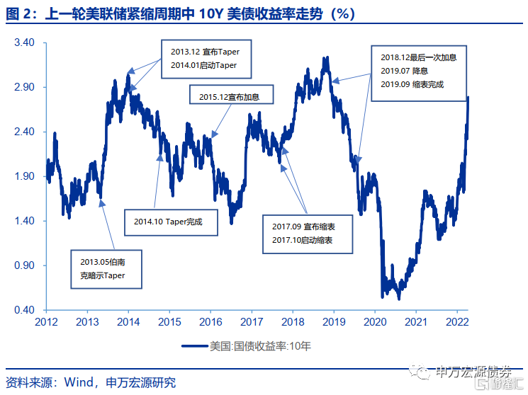在上一轮紧缩周期中,由于美联储没有事前和市场充分沟通,2013年5月美联储议息会议和伯南克国会证词突然释放Taper信号,造成市场“缩减恐慌”,10Y美债收益率陡峭上行,并于2013年12月31日触及阶段性高点3.02%,共上行约140bp;2015年12月美联储启动首次加息,并于2017年9月宣布缩表,10Y美债收益率于2018年11月8日触及3.24%高点,形成典型的双峰“M”型走势。