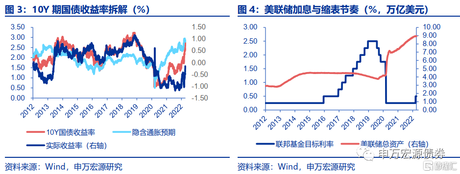 (5)缩表+加息期间,10Y美债收益率先上后下,于2018年11月触及3.24%的高点。美联储于2017年3月讨论缩表,2017年6月给出缩表计划,2017年9月正式宣布于10月启动缩表,期间每季度加息25bp,一直到2018年12月完成最后一次加息,联邦基金利率维持在2.25%-2.5%的区间。期间美债震荡上行,拆解来看,10Y美债收益率上行主要是源于实际利率的上行,隐含的通胀预期基本保持稳定。2018年12月后,美国经济出现衰退迹象,之后美联储也停止加息,并发布资产负债表正常化计划,10Y美债收益率快速回落。
