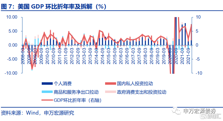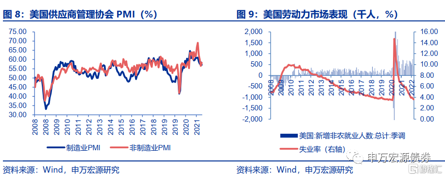 上一轮紧缩周期与本轮紧缩周期的通胀表现有较为明显的差异,2008年金融危机后,美国通胀中枢整体回落,2012年后CPI和PCE围绕2%中枢波动,2014年下半年到2015年上半年CPI和PCE逼近零值;但2020年新冠疫情爆发后,美国通胀压力飙升,CPI和PCE双双破6%,并且核心CPI和PCE也居高位,美国商品和服务的价格普遍上行,面临全面的价格上涨压力。