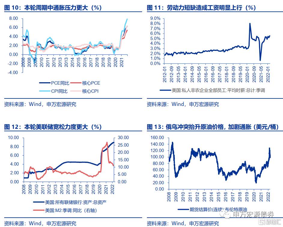 (4)通胀水平不同:上一轮紧缩周期与本轮紧缩周期的通胀表现有较为明显的差异,金融危机后,真正的货币增长有限,通胀中枢回落;而疫情后美联储和财政配合大量增加货币的量化宽松政策,推动疫情后期通胀明显升温。