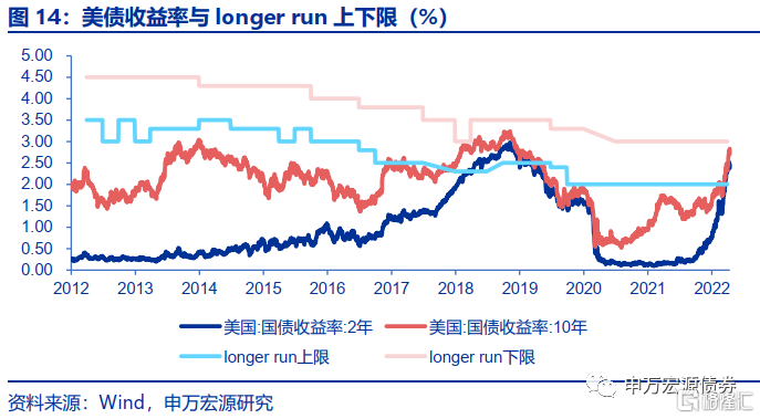 根据美联储最新公布的3月点阵图,2022年联邦基金利率加息区间在1.6%-2.4%,均值为1.9%,2023年在2.4%-3.1%,均值为2.8%,longer run区间为2%-3%,如果未来长期联邦基金利率维持3月份的这个预测区间,预计10Y美债收益率有望见到3%左右的水平,超过3.5%的概率目前来看并不高。