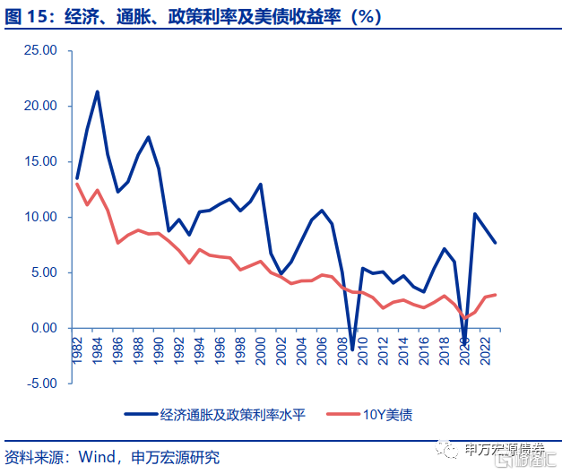 过去10年中,可类比的经济向好、通胀高且政策利率高位的年份是2018年,2018年的GDP、PCE、政策利率中枢分别为2.9%、2.14%和2.12%,2022年和2023年的经济通胀与政策利率拟合的债券收益率高点略高于2018年,2018年10Y美债收益率高点为3.24%,本轮债熊美债收益率有望略超过2018年高点,但超过3.5%的概率尚不大。
