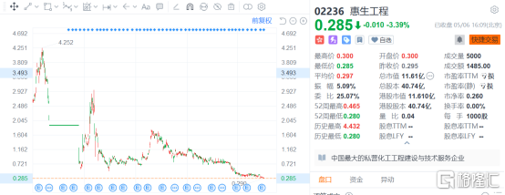 查阅惠生工程历年的股价走势可以发现,2013年公司股价最高曾达到4港元,总市值达到上百亿。在高层动荡经历一段时间停牌后,惠生工程股价曾在2015年有过短期上扬,但随后便一蹶不振。如今已然成为港股众多老仙股之一,股价仅有0.285港元,总市值也仅有11.61亿。