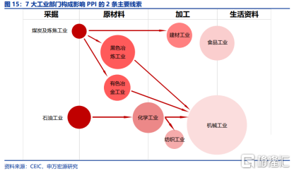从产业链条来看,石油化工与煤化工的下游终端需求主要为机械工业与建材工业。过去一年,石油与煤炭的价格飙涨,PPI快速上行,并通过产业链层层传导至中下游。