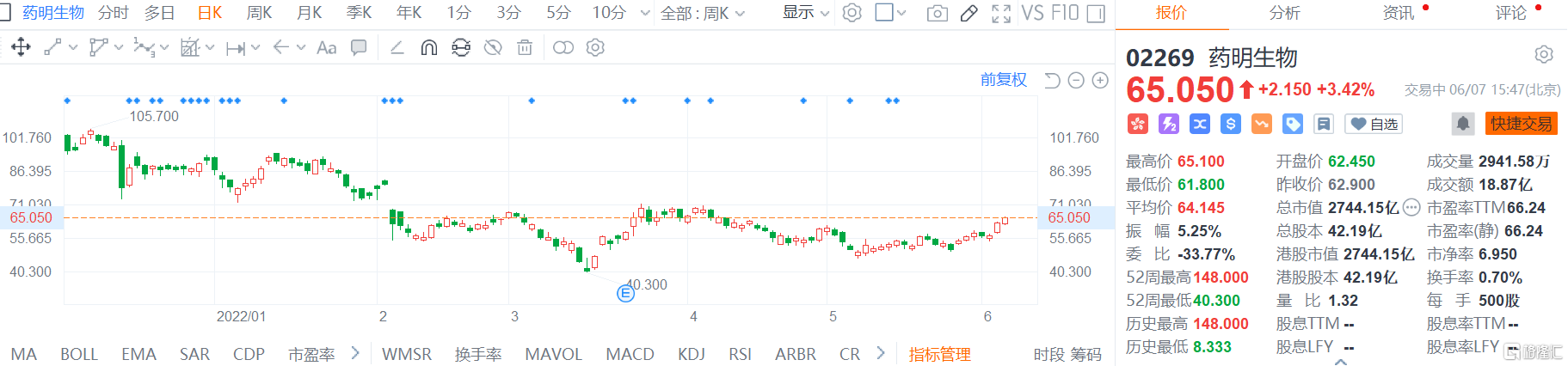 格隆汇6月7日丨昨日大涨10%的药明生物(2269.HK)今日再度涨3.4%,报65.05港元,创两个月新高,总市值2744.2亿港元。资料显示,该股昨日获南下资金净买入4.717亿港元,月内累计净买入7.37亿港元。