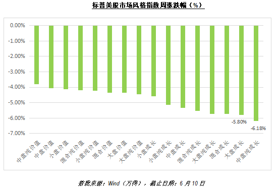 标普美股市场风格指数全部下跌,跌幅最大的是中盘纯成长和大盘成长,分别下跌6.18%和5.80%。