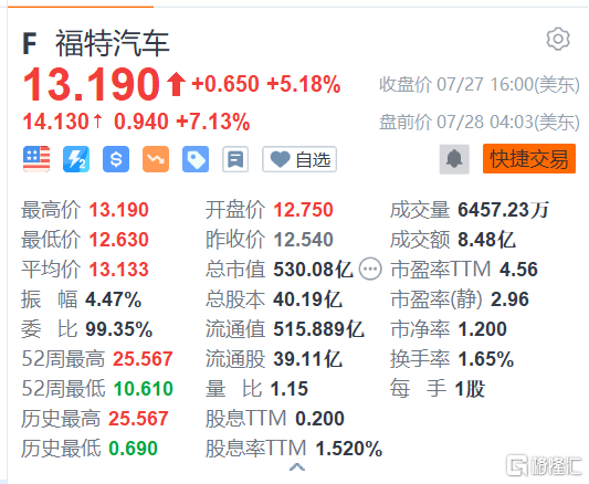 美股异动丨福特汽车(F.US)盘前涨超7% Q2业绩超预期