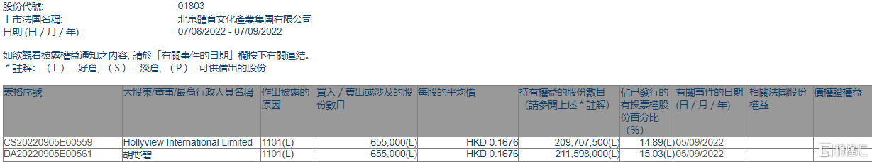 北京体育文化(01803.HK)获非执行董事胡野碧增持65.5万股