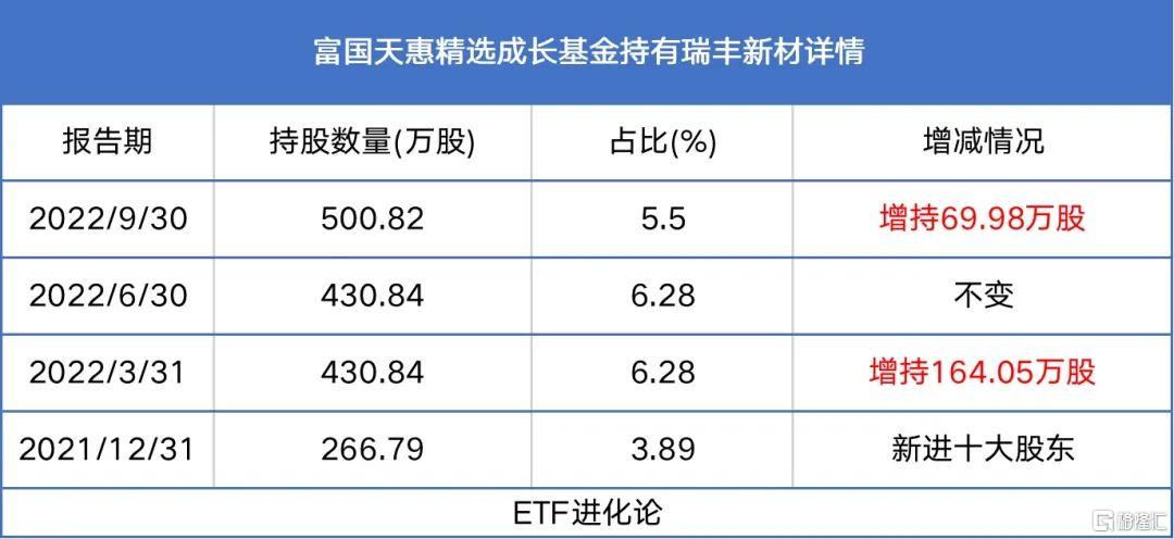 截至三季度末,富国天惠持有500.82万股瑞丰新材,持股市值8.1亿。瑞丰新材主要从事油品添加剂、无碳纸显色剂等精细化工系列产品研发、生产和销售,核心产品为润滑油添加剂。