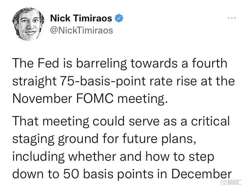 10月21日,有“新美联储通讯社”之称的华尔街日报记者Nick Timiraos在推特放风称:美联储预计将在下次利率会议上(11月1日-2日)再次加息75个基点,届时可能会讨论是否以及如何释放12月放缓加息步伐的信号。