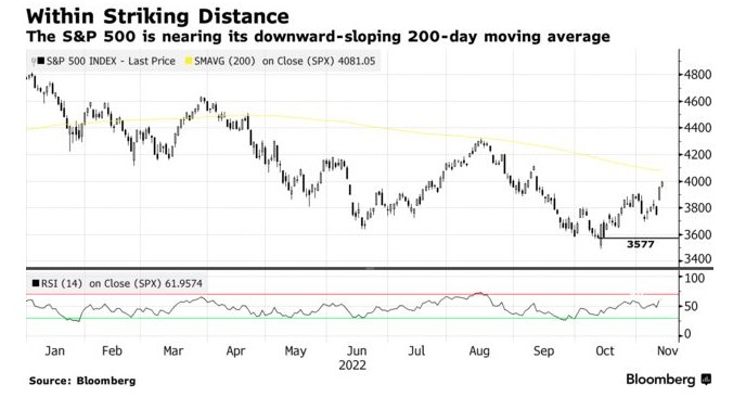而上周四由CPI推动的反弹让投资者看到希望。随着标普500指数接近200日移动平均线,最新一轮反弹可能还有更大的空间。目前,标普500指数较10月中旬的低点上涨了近11%。