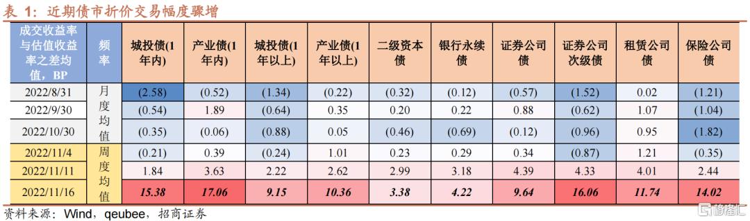 意料之外的是,这一防御力度是远不足够的。10月开始,资金中枢上抬,顺势带动存单收益,而防疫政策优化与地产行业纾困政策密集出台,无疑进一步撼动了债市投资者的信心。11月以来,10年国债估值收益上行幅度近19bp,票息资产更是在近期出现了罕见的流动性践踏,两点证据得以说明:第一,折价成交惊人。一方面,流动性偏弱的城投债和产业债,90%左右的交易都以折价形式达成。另一方面,11月14日开始,1年期以内票息资产成交与估值平均差值骤升至15bp以上(截至11月16日),包括证券次级债和保险公司债等都出现“砸盘”。要知道8月至10月,债市抢配才是主流,低估值配置是常态。