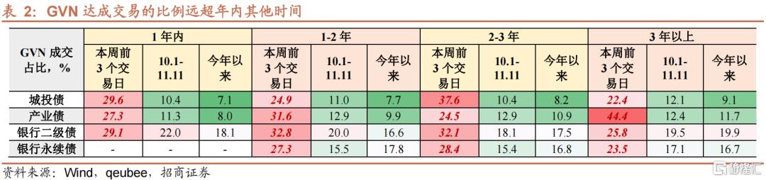 第二,急于变现资产。折价交易潮中,不同券种GVN成交笔数占总成交的比例远超年内其他时间表现。并且,出现两点恐慌蔓延的特征:一是期限偏长的非金融信用债面临的压力更大,3年期以上产业债成交平均GVN比例达到44%;二是历经两天调整,11月16日仍有大范围“甩卖”的迹象。这意味着什么?GVN达成交易意味着接受买盘报价,目前情况反映两点信息:一是出券的机构有急售诉求,这不是单纯看空后市,更合理的解释是账户被赎回所致;二是市场买盘稀少,上演流动性踩踏。