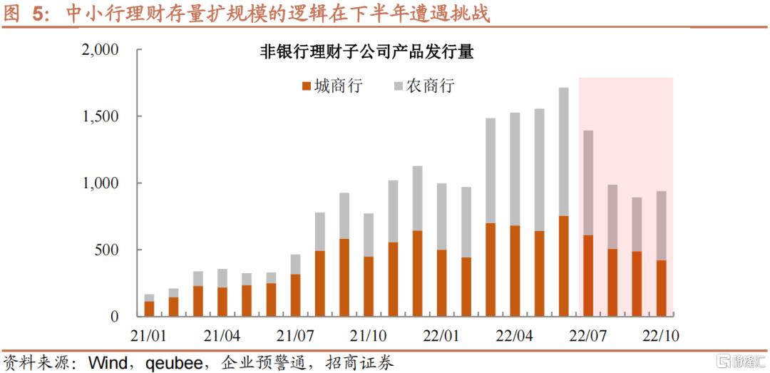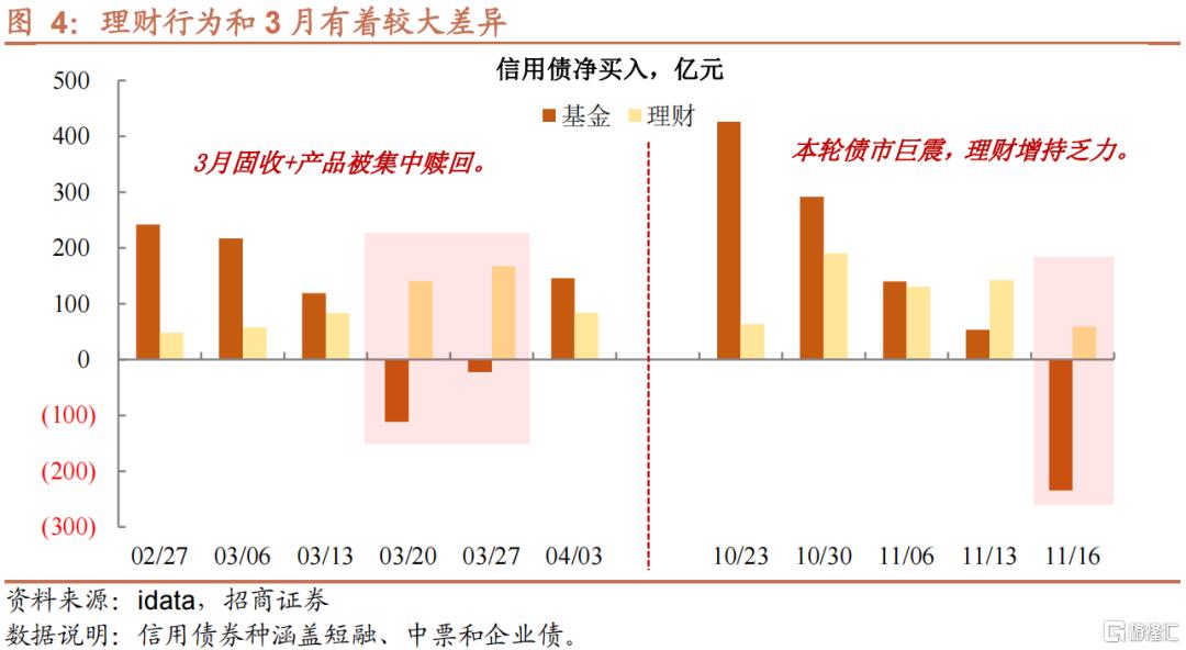 第一,理财净买入力度,本轮偏弱。2月至3月,权益资产过快下跌,导致不少固收+产品踩到回撤线,而相关产品开放期又集中在同一时间段。因此,一是出于止损的考虑,二是防范自身负债端波动,理财不得不选择赎回固收+基金。不过,从当时理财净买入信用债的情况来看,3月下旬依旧维持在较高水平,加上新增产品恢复,有效缓释负债端压力。而11月14日以来,基金大规模抛售时期,理财配置虽有,但幅度不及3月,加上近期理财子公司新发产品受阻,及中小行理财控存量,当前负债端压力或超3月。