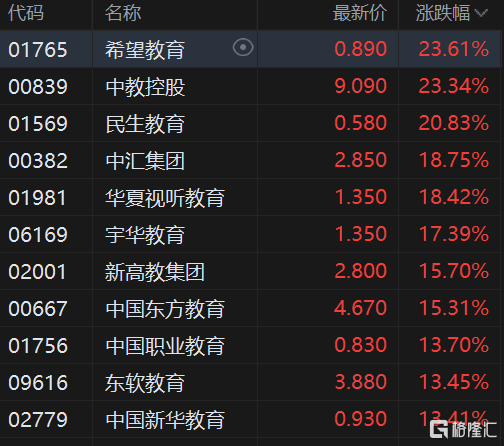 盘面上,受美股中概股上涨影响,港股科技股表现较为强势,美团涨6.5%,网易涨近6%,快手、京东涨近5%,阿里巴巴、百度、腾讯皆上涨;机构指发展职业教育具有长期必要性,教育股大幅拉升上扬,中教控股、中国东方教育领衔上涨;70款游戏获批,游戏股全线拉升,互联网医疗股继续走高,影视娱乐股、餐饮股、药品股齐涨,昨日大跌的汽车股部分回稳。 另一方面,铝制品股表现最弱,猪肉概念股、内险股、石油股、大金融股普跌。