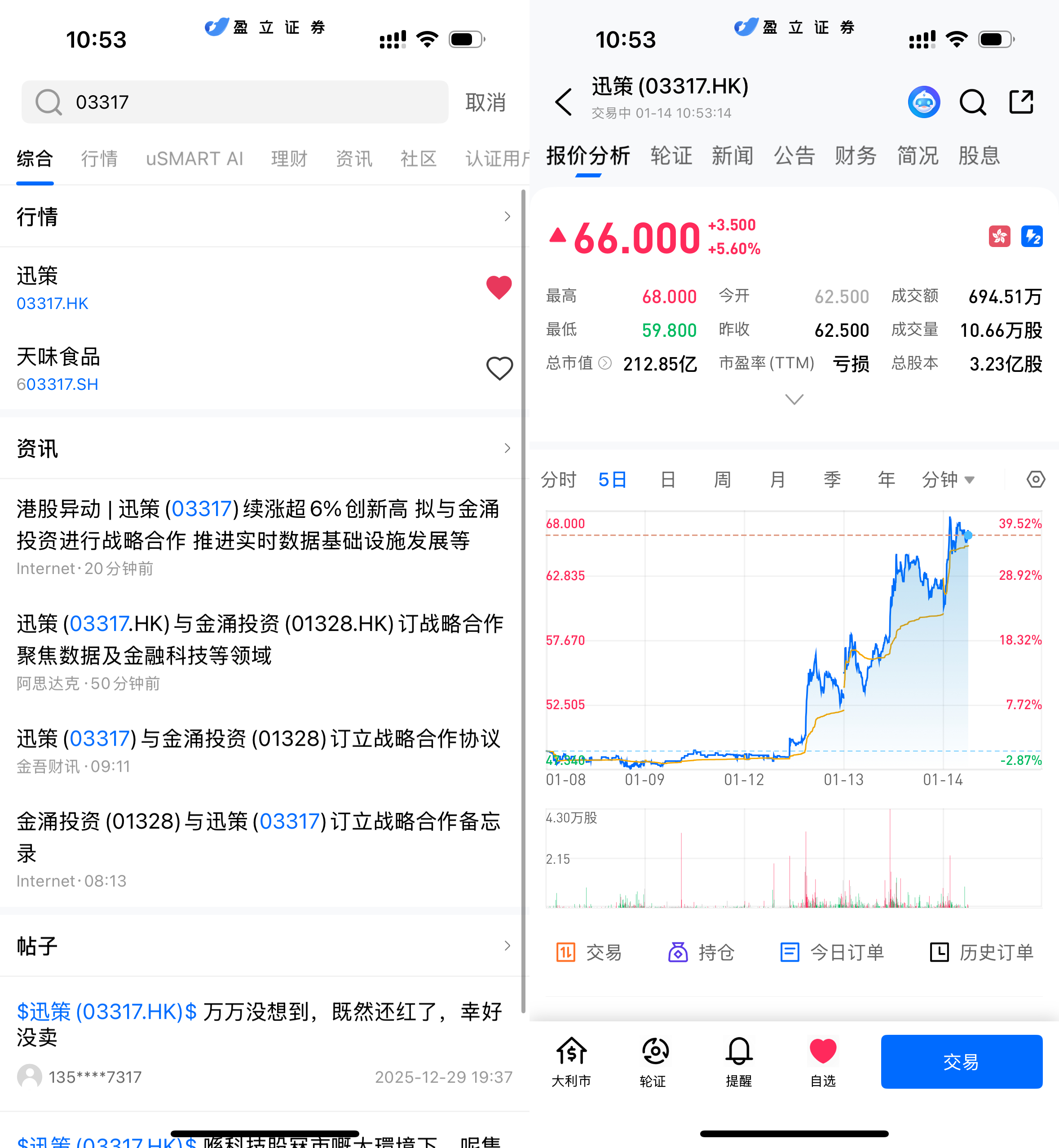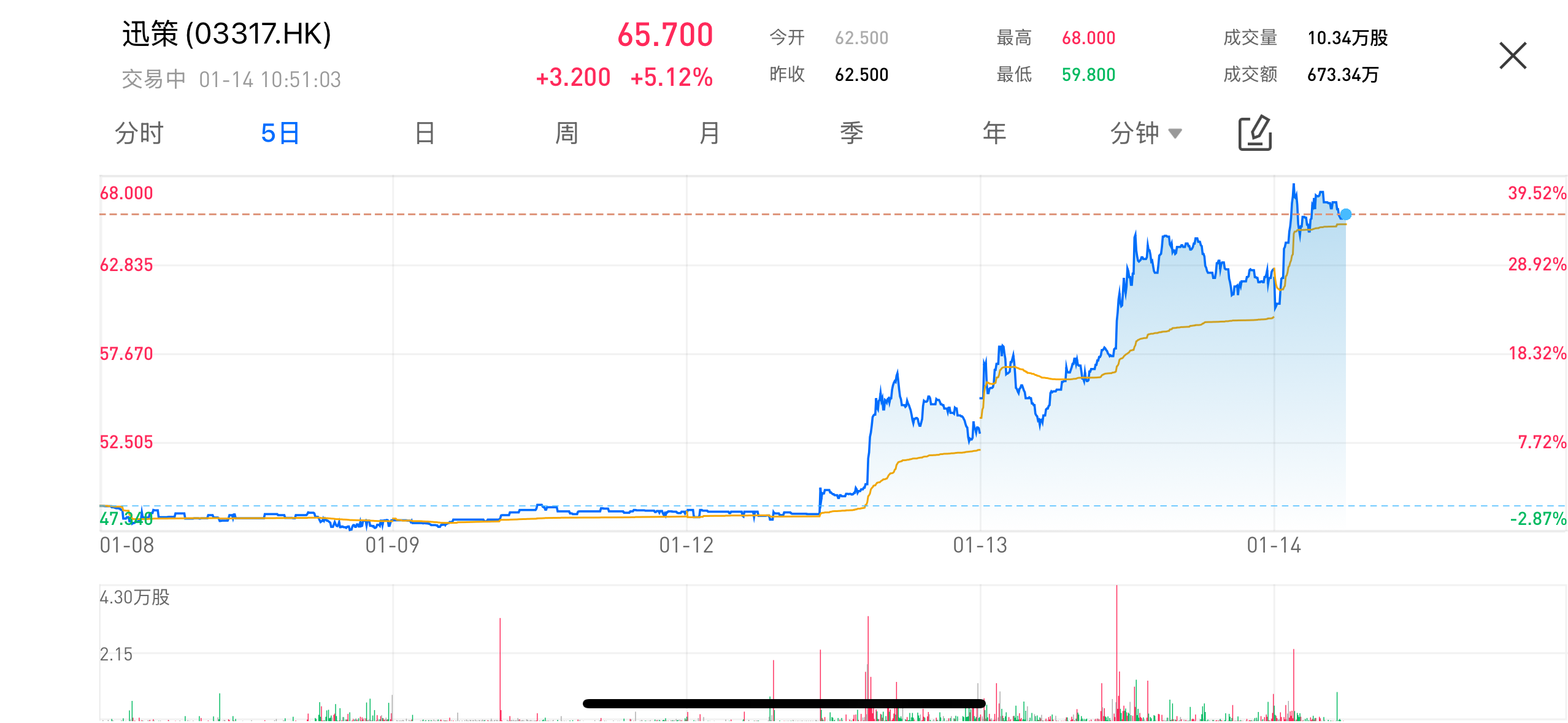 2026年1月14日,讯策科技股份有限公司(03317.HK)今天的股价涨幅显著,最新报65.70港元,较昨日收盘价62.50港元上涨了5.12%。近期,讯策股价持续攀升,创下68.00港元的阶段性高点,标志着市场对其未来发展前景的强烈信心。