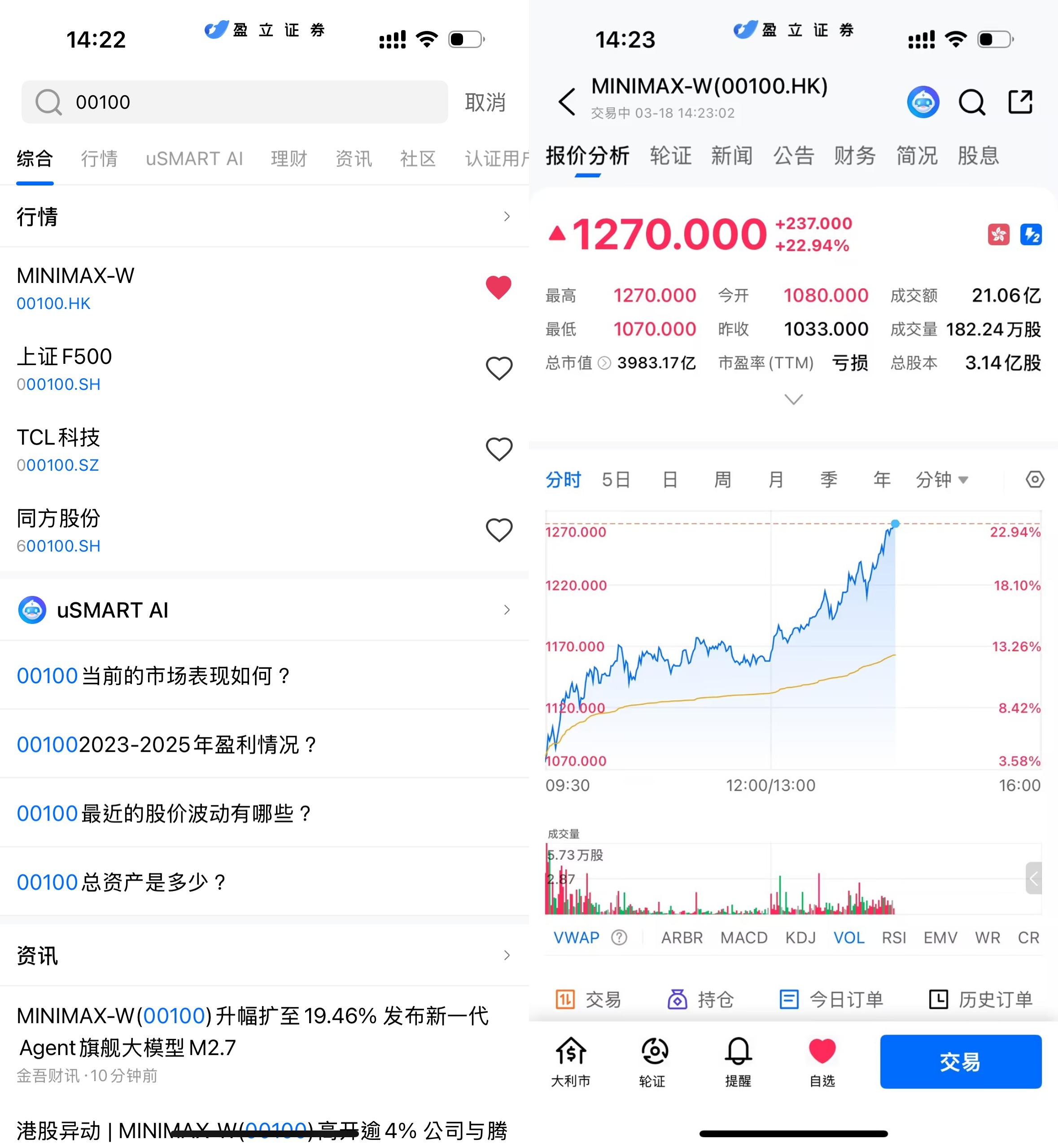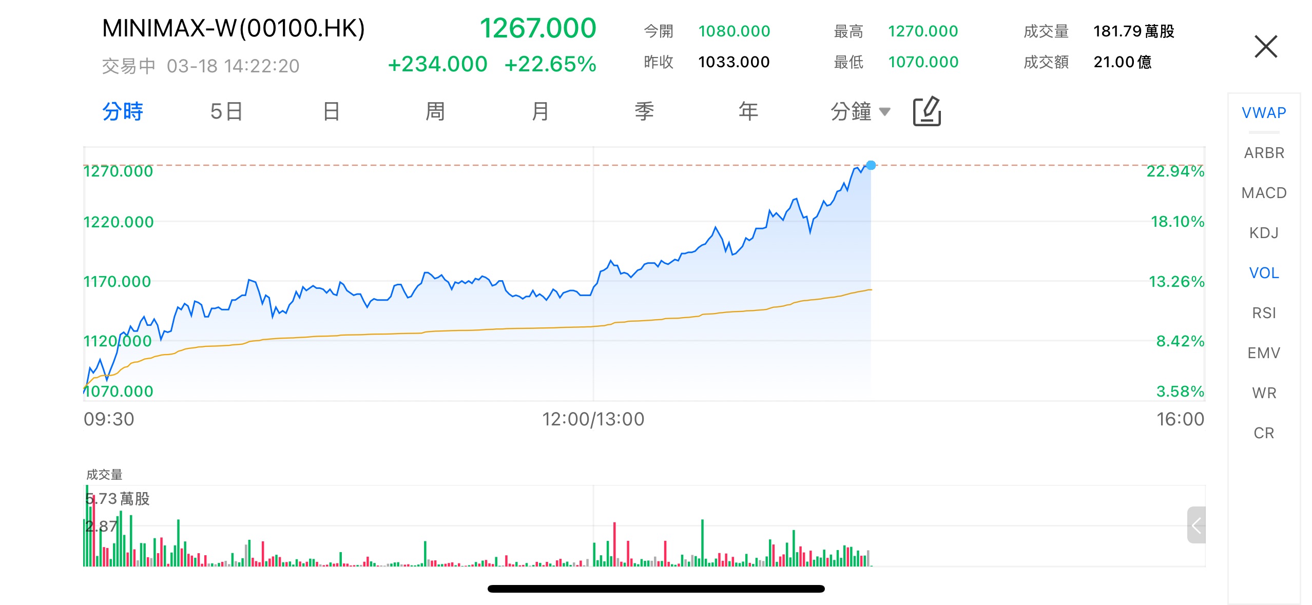 3月18日,AI公司 MiniMax 正式发布新一代Agent旗舰大模型M2.7,首次对外展示其“模型自我进化”技术路径。受消息提振,公司相关概念股MINIMAX-W(00100.HK)盘中大幅走强,股价一度触及1270港元附近,涨幅超过22%,成交额显著放大,成为当日港股市场焦点之一。