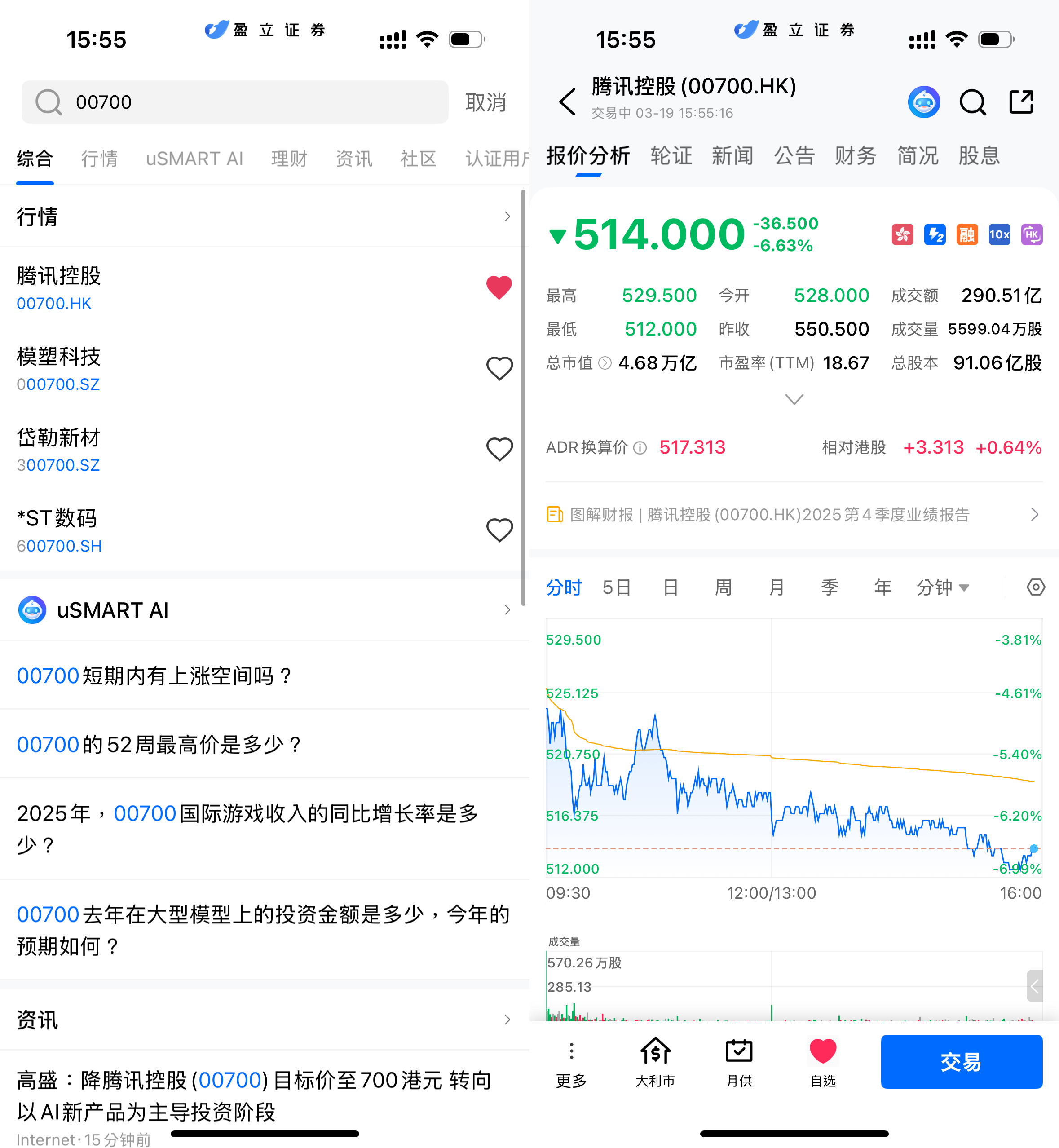 登入 uSMART HK APP 后,于页面最右上方点击「搜索」,输入标的代码(00700.HK)并进入详情页,了解交易详情与历史走势。点击右下角「交易」,选择交易类型,最后填写交易条件后送出订单即可。