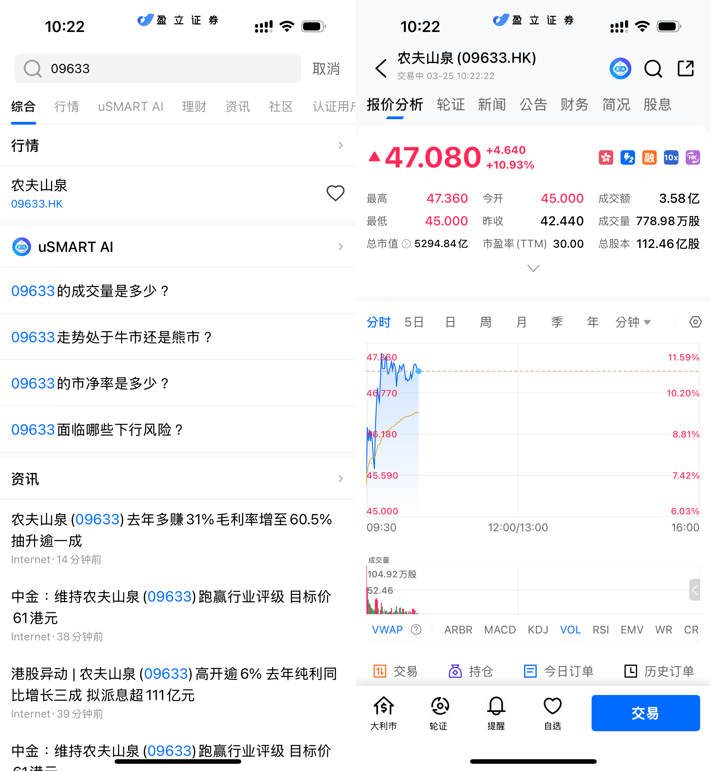 3月25日早盘,港股消费龙头农夫山泉(09633.HK)股价显著走强,盘中涨幅一度扩大至近11%。截至10时22分,公司股价报47.08港元,大涨10.93%,成交额达3.58亿港元,成交量明显放大,资金抢筹迹象显著。