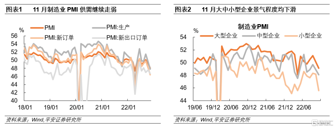 分企业规模来看,各类型企业景气程度均明显回落,尤其是小型企业制造业PMI降至今年4月水平。11月大、中型企业制造业PMI环比分别下滑1.0、0.8个百分点,至49.1%、48.1%,供需两端均明显走弱。而小型企业制造业PMI下滑尤为明显,达到2.6个百分点,11月小型企业制造业PMI为45.6%,与今年4月持平。