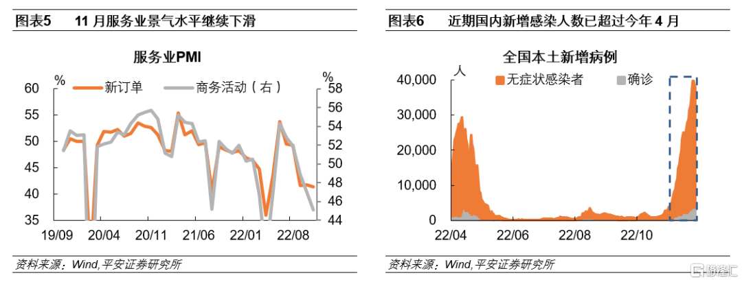 第五,服务业景气水平连续五个月下降。11月国内疫情形势更加严峻,11月29日全国单日新增感染人数已超3.7万人、超过4月全国性疫情单日新增感染高点。在此背景下,11月服务业PMI商务活动指数进一步走低,环比回落1.9个百分点至45.1%。其他分项指数中,除销售价格指数小幅回升外,新订单、业务活动预期、从业人员等指数均出现了不同程度的下滑,尤其是从业人员指数降至2020年2月以来新低,考虑到服务业在我国就业市场的重要性,“稳就业”或面临更大挑战。分行业来看,多数服务业行业均位于收缩区间,国家统计局公布的数据显示,在调查的21个行业中,有15个位于收缩区间,其中道路运输、航空运输、住宿、餐饮、文化体育娱乐等接触性聚集性行业商务活动指数甚至低于38.0%。