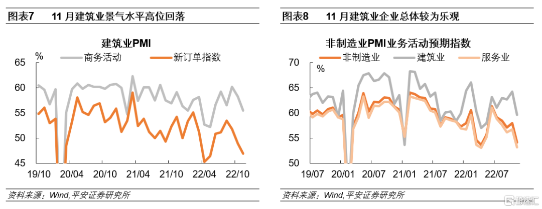第六,建筑业景气水平高位回落。建筑业新订单指数已连续4个月出现下滑。其中,基建投资的推进对建筑业支撑进一步加强,这同时意味着,房地产行业整体的施工进度或并不理想,这是11月以来地产融资“三箭齐发”的主要关切所在。