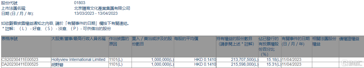 北京體育文化(01803.HK)獲非執行董事胡野碧增持100萬股