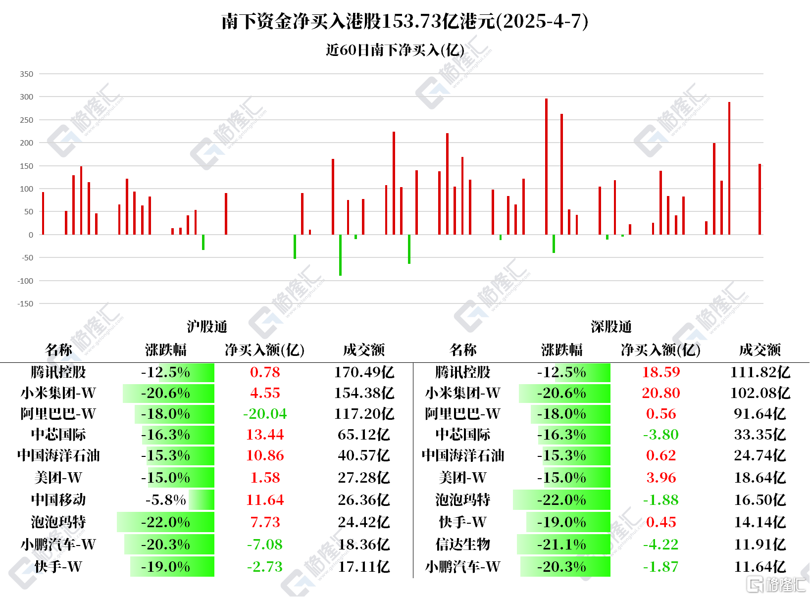 4月7日,港股暴跌之际,南下资金净买入港股153.73亿港元。