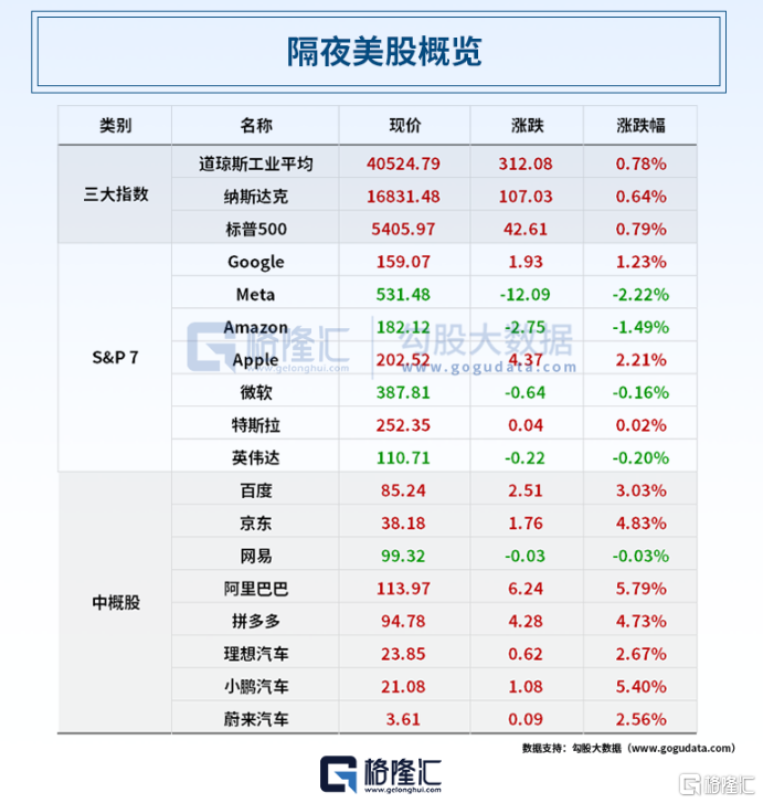 大型科技股多数上涨,苹果公司涨2.21%,谷歌A涨1.23%,特斯拉涨0.02%,微软则收跌0.16%,英伟达跌0.2%,亚马逊跌1.48%,Meta跌 2.22%。热门中概股普涨,纳斯达克中国金龙指数收盘涨3.23%。阿里巴巴、小鹏汽车涨超5%,京东、拼多多涨超4%,百度涨超3%,理想汽车、蔚来涨超2%。微牛证券收盘涨374.72%,多次触及熔断。
