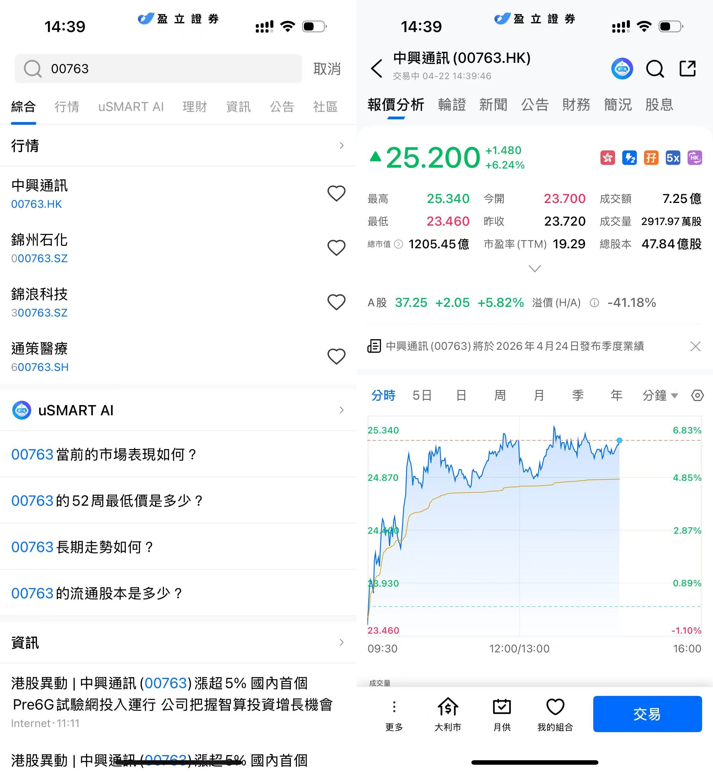 登入 uSMART HK APP 後,於頁面最右上方點擊「搜索」,輸入標的代碼(00763.HK)並進入詳情頁,瞭解交易詳情與歷史走勢。點擊右下角「交易」,選擇交易類型,最後填寫交易條件後送出訂單即可。