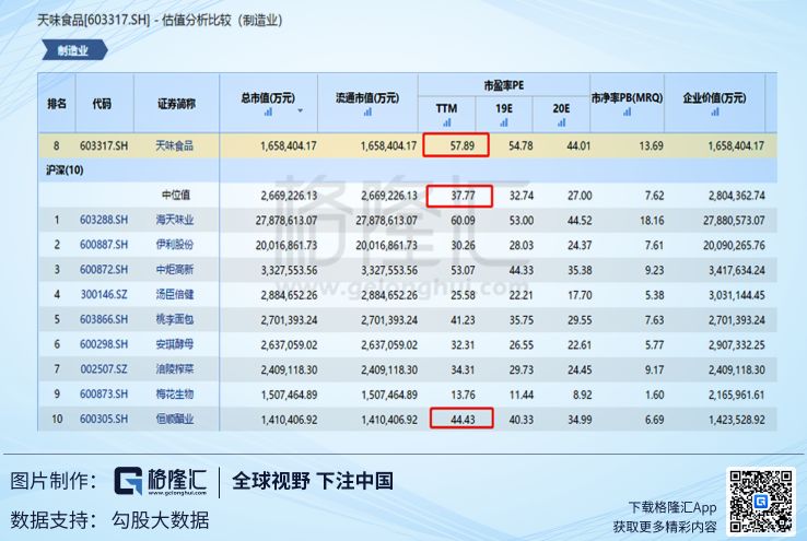 同时选取食品饮料行业中市值最大的十家快消品公司作对比,行业平均市盈率在35X左右,一般的公司PE都在30X到40X之间,而天味食品将近60X的估值是绝对高估的。