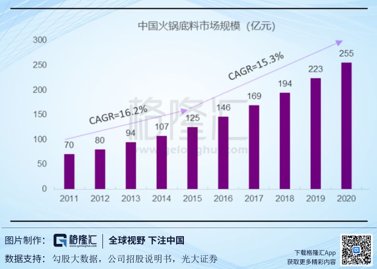 占据公司最大营收的火锅底料产品这部分,占比近50%。相关机构给的数据是,2015年国内只有小部分火锅餐厅再用包装的火锅底料,绝大多数餐厅都是采用自制的方式,因为这样更加经济,节省成本。同时火锅底料市场规模2015年才59亿元,2015年也只有125亿元。根据这种增速测算,乐观估计2020年的规模也就650亿。