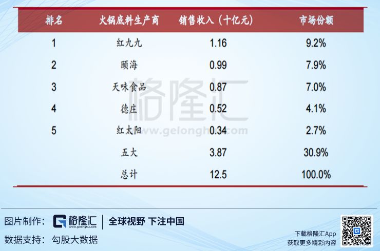 同时火锅底料市场的行业集中度不高。国内火锅我国火锅底料市场前三大企业为24.1%,CR5为30.9%,集中度偏低。其中前三大红九九、颐海、天味食品的市占率分别为9.2%、7.9%、7.0%,第四名及以后的市占率不到5%。