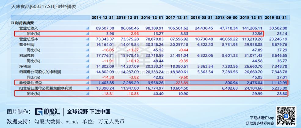 从公司财务角度看,营业收入前几年增长很慢,而且还出现过负增长,但是到了18年就同比大增30%以上,这与公司近几年产能下滑的逻辑是不相符的。也不排除公司为了IPO进行了利润调整。仔细观察就会发现,天味食品的非经常性损益历年占净利润的比例都很高,这部分的收益都是一次性的。扣非之后净利润增速也没那么快。投资者应该提防非经常性损益连年攀升的趋势,其实也开始出现这种苗头了,2019年一季度这块的收益比18年二季度高太多,单季几乎达到了2018年全年的一半。