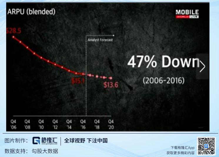 我们可以看看我国运营商的财报数据,三大运营商在2G时期,每个用户的每月话费支出(简称APRU值)大概在30美元左右,到了3G时代,APRU大概是15美元左右,从2018年财报看,4G时期三大运营商APRU更是降到了8美元。有数据统计,近十年来,全世界运营商的APRU下降了47%。