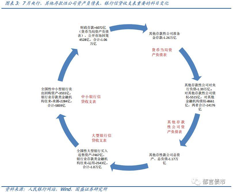 7月其他存款性公司总资产、总负债环比减少1.17万亿,也就是银行在“缩表”。除此之外,7月金融机构资产负债表和信贷收支表有几个1万亿的数字,可能描述了流动性边际收紧的链条:
