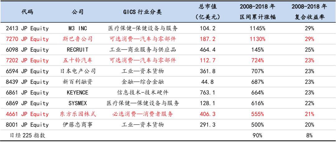而日本2008-2018年收益率排名前十的公司中,斯巴鲁、五十铃汽车、东方乐园株式协会这三只消费股分列第二、第四、第九位,汽车股排名靠前,其年化收益率达到29%、23%、21%,累计涨幅为11.3倍、7.24倍、5.55倍,均大幅跑赢日经225指数。