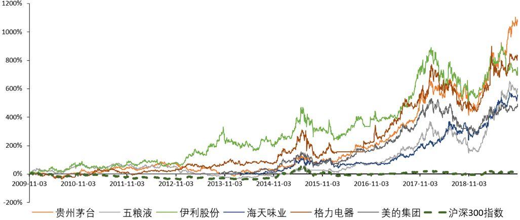 复盘10年股价表现,贵州茅台、五粮液、伊利股份、海天味业、格力电器、美的集团涨幅达到10.8倍、6.1倍、7.6倍、5.6倍、9.1倍、5.3倍,而同期沪深300指数只录得16%涨幅,远远跑输消费白马股。