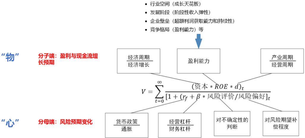 从公式我们可以看出,DDM模型的分子端代表了盈利能力和成长性,描述的是投资者对企业未来经营的预期,即对客观世界“物”的预期。