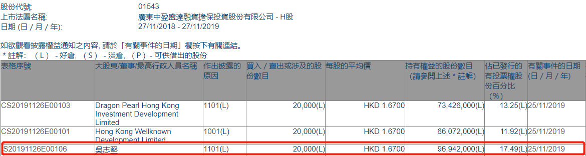 中盈盛达融资担保(01543.HK)获吴志坚增持2万股