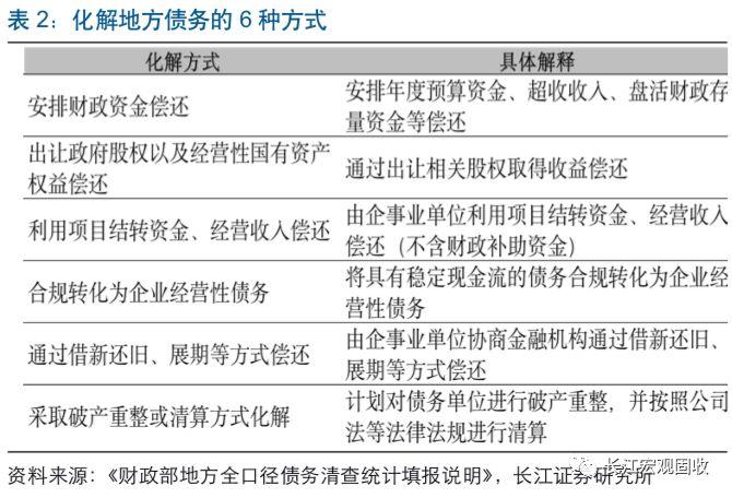 防范化解地方债务风险,是减轻高杠杆压制的重要途径,主要从“控制增量”和“化解存量”两个方面展开。“控制增量”方面,通过政府投资条例、央地事权划分等制度配套组合,明确地方财政支出责任,规范政府投融资行为,遏制隐性债务增长。“化解存量”方面,以债务置换、债转股、市场化退出等方式进行,按照财政部统计要求,可具体划分为出让政府股以及经营性国有资产权益偿还、破产重整或清算方式化解等6种方式。近期讨论比较多的AMC购买融资平台债务,可归为重整或清算方式,此前中国信达已参与化解地方隐性债务相关项目余额约70亿元。