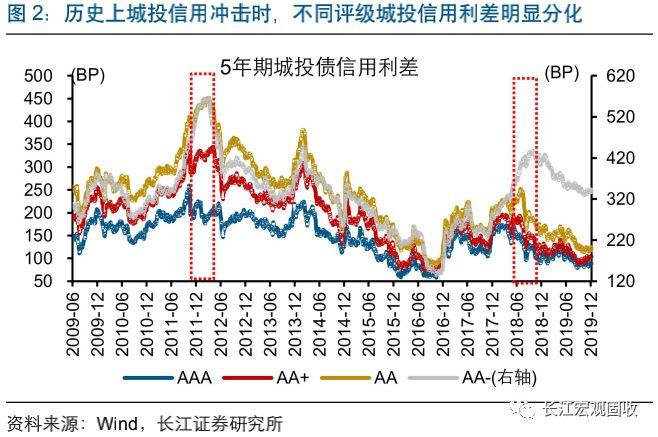 (1)随着前期大规模发行的城投债陆续到期和进入回售期,部分融资平台出现再融资、债务偿付困难等情况,引发城投“信仰”担忧。历史上出现城投信用冲击时,不同评级城投债信用利差会明显分化。