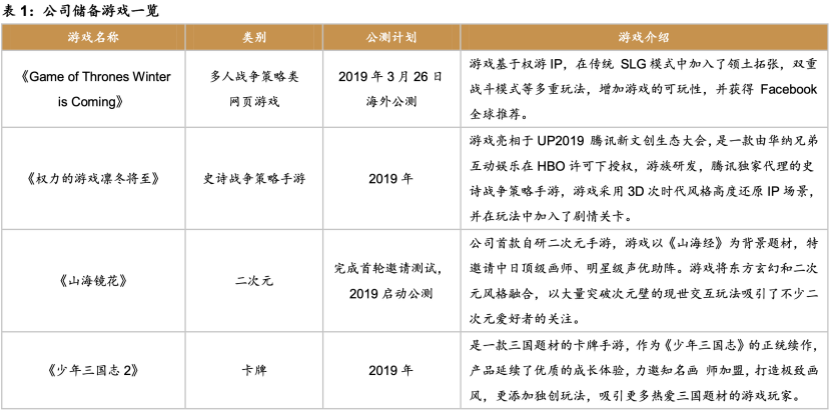 公司的IP版图中拥有大量TOP级IP,包括在全球引发强烈关注,掀起追剧狂潮的《权力的游戏》以及在国内经久不衰,粉丝基础庞大的《盗墓笔记》。同时公司积极发掘中国传统文化的商业价值,以国学经典《山海经》为背景框架打造二次元游戏产品《山海镜花》,被市场一致期待。2019年《权力的游戏》第八季播出,第八季为系列电视剧的最终季,百度指数显示最终季的播放导致《权力的游戏》成为人们关注的焦点,截至第八季第二集,百度指数就创下历年最高,达到152843,远远高出历史最高值92285。公司已计划开展《权力的游戏·凛冬将至》的公测,该款游戏在TAPTAP平台的预约量已达到11万+。公司有望乘势高热度的话题讨论和粉丝效应,利用粉丝的留恋与不舍心理,在2019年借助TOP级IP带动业绩迈上新台阶。