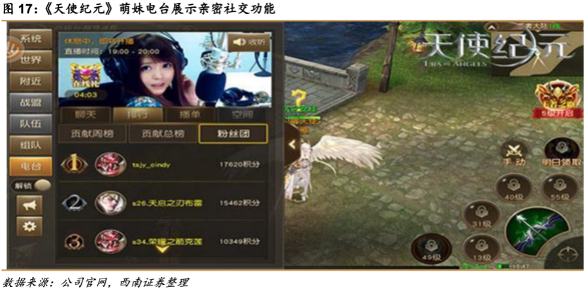 自研MMOARPG手游《天使纪元》在游戏运营中加入“电台运营”这一全新模式,精心打造了游戏内置电台——萌妹电台。启用八位校花主播,吸引众多专业主播常驻,提升玩家游戏的愉悦感。通过电台为用户服务,电台不仅为大家播出唱歌、互动聊天等节目,丰富玩家的游戏体验,更成为用户反馈游戏意见建议的全新渠道。研发团队通过电台节目与用户互动,建立线上用户面对面沟通的枢纽。获取用户的诉求,实现及时反馈,从而不断优化产品。同时公司举办活动,让用户通过电台走近项目组,了解游戏团队日常工作及开发中的故事,从而拉近制作团队与用户之间的距离,进一步提升用户的游戏参与感和忠诚度。