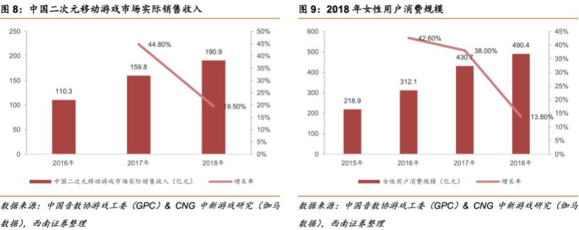 根据《2018年中国游戏产业报告》,2018年收入前100移动游戏中动作角色扮演类游戏、回合制角色扮演类游戏、卡牌游戏、策略游戏市场份额占比合计超过60%,利于公司市场份额的进一步提升,而这也正是公司的常胜项目;2018年中国游戏市场女性用户规模为2.9亿人,同比增长11.5%,增幅明显;2018年中国二次元移动游戏市场实际销售收入达190.9亿元,同比增长19.5%,占中国移动游戏市场14.3%。细分领域作为游戏市场新的增量,爆发出巨大能量,成为公司下一步重要的战略高地。