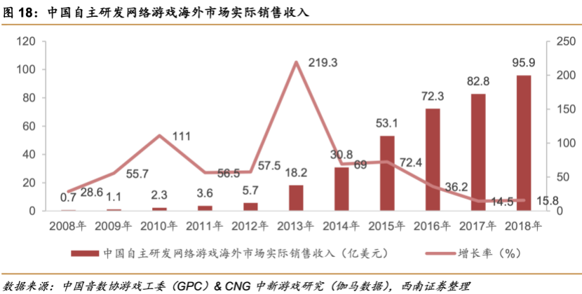 随着国内游戏版号的收紧,加上国内市场出头难度逐渐增高,中国各家游戏厂商瞄准了广阔的海外手游市场。中国通过多年发展和计算机教育培养了一大批网络游戏程序员,在游戏开发和生产上具有他国难以比拟的优势,拥有持续不断推出高质量产品的能力,得以强势进军海外市场,抢夺其他本土产品的市场空间。2018年,中国自主研发网络游戏海外市场实际销售收入达到95.9亿美元,同比增长14.5%,市场增长潜力颇为可观。