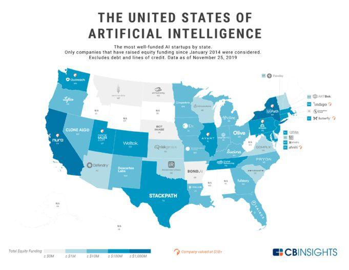 (美国人工智能融资分布图,图片来自CBinsights,版权属于原作者)