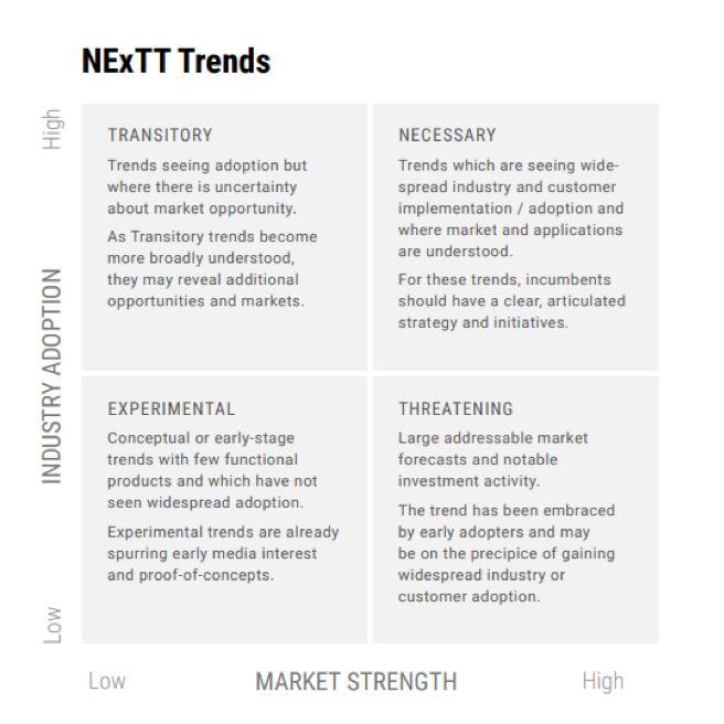 在此次研究中,CB Insight还提出了NexTT框架,根据行业采用率(Industry Adoption)和市场优势(Market Strength)评估了每一种趋势,并将其归类为暂时(Transitory)、必要(Necessary)、实验性(Experimental)、威胁性(Threatening)四大类。暂时性指有应用但是未确定市场的趋势;实验性是指试点企业或初创公司的产品没有被广泛应用,但已初步引起媒体兴趣和概念认证的趋势;威胁性是指已有大规模市场投资活动,已经被市场初步采纳并具有大规模市场应用的趋势;必要性是指已经广泛采用、拥有市场并且被大众理解的趋势。